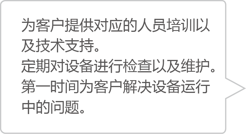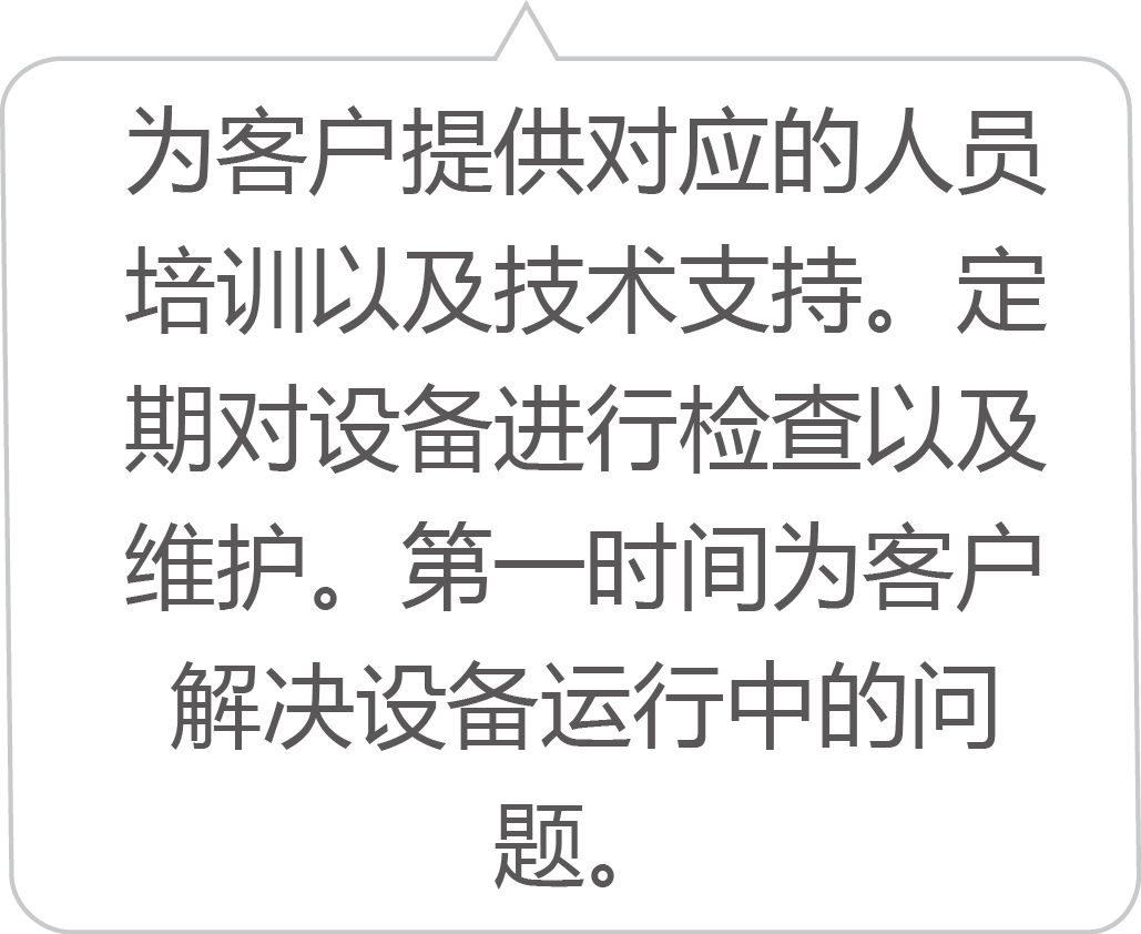 为客户提供对应的人员培训以及技术支持。定期对设备进行检查以及维护。第一时间为客户解决设备运行中的问题。